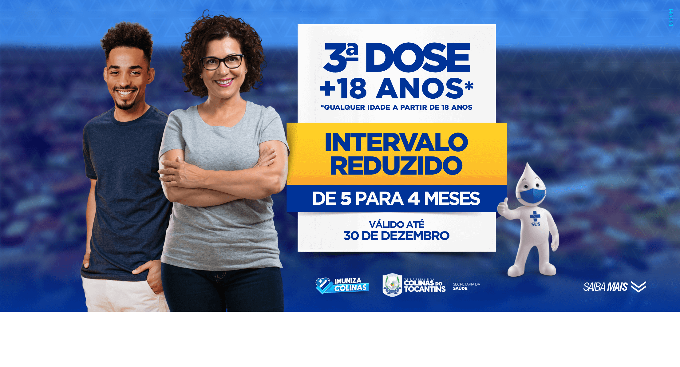 Prefeitura de Colinas (TO), por meio da Secretaria de Saúde, amplia vacinação contra a Covid-19, com a 3ª dose, para todas as pessoas com mais de 18 anos. A vacina pfizer está disponível nas Unidades Básicas de Saúde (UBS) do Município, até dia 30 de dezembro e todos que tiverem quatro meses, da 2ª dose, podem ser contemplados.