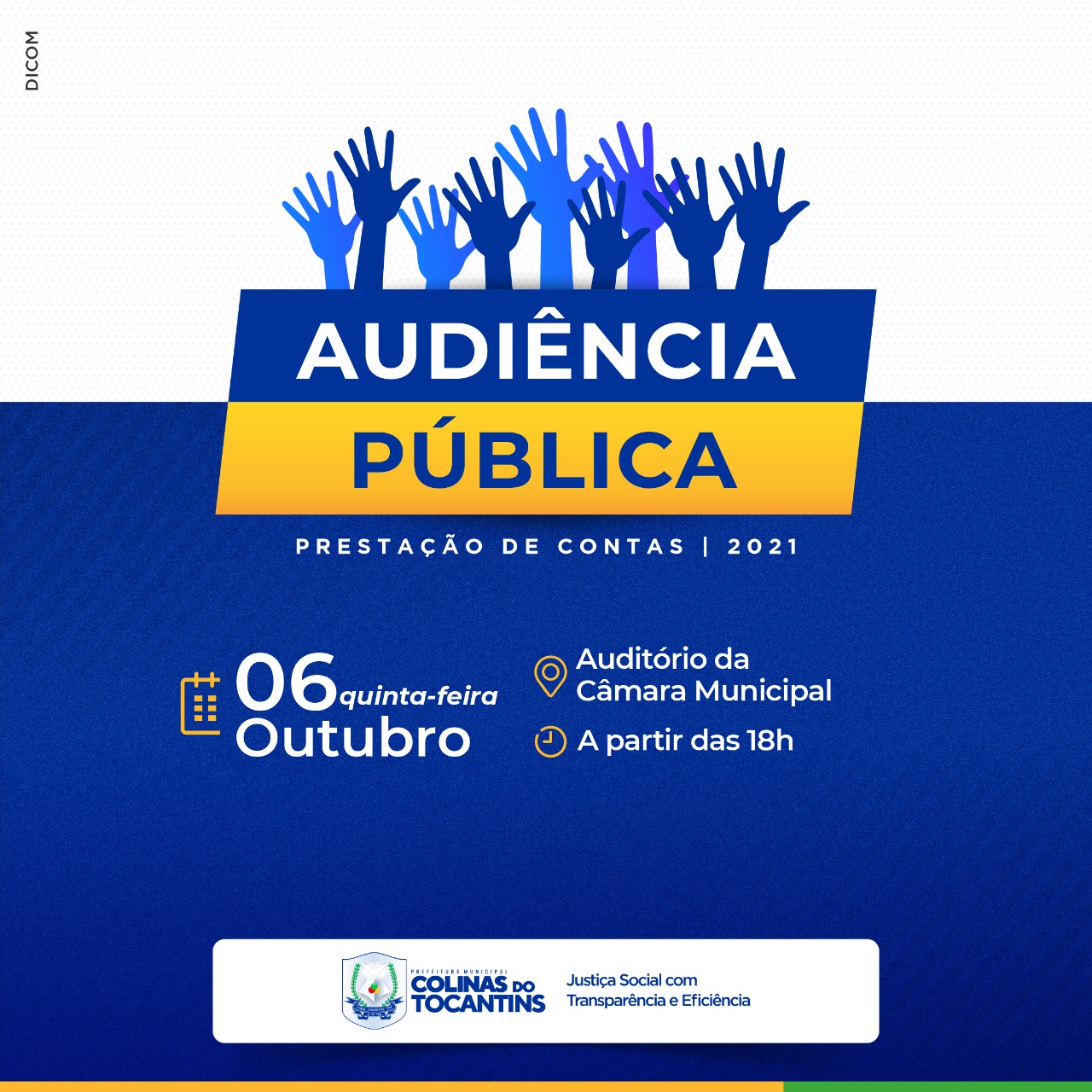 Por fim, informamos que estão disponíveis informações sobre Audiência Pública da Secretaria de Finanças, Secretaria de Educação, Secretaria de Saúde, Secretaria de Assistência Social da Prefeitura Municipal de Colinas, cadastradas e agendadas para o próximo dia 06 de outubro de 2022, no auditório da Câmara Municipal de Colinas do Tocantins.