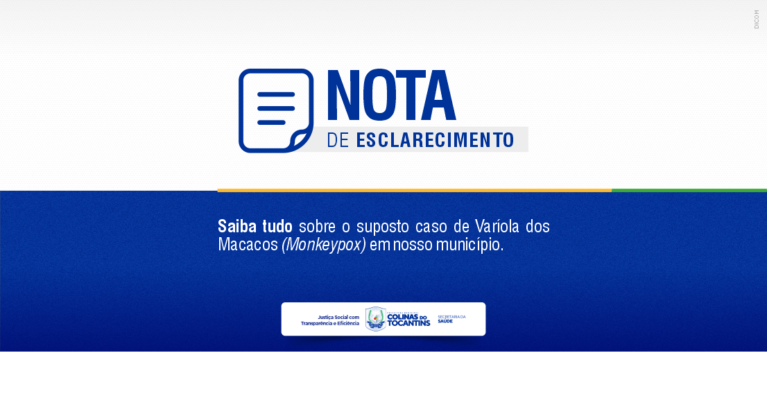 A Secretaria Municipal de Saúde, por meio da Diretoria de Vigilância em Saúde, informa que foi notificado na data do dia 29 de julho de 2022, 01 (um) caso suspeito para a doença Monkeypox (Varíola dos Macacos).